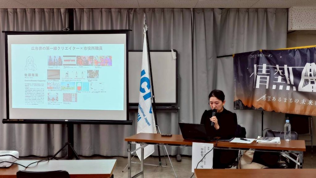 最初に、福知山城の初代城主で福知山のまちづくりの基盤をつくった明智光秀が主人公の大河ドラマ「麒麟がくる」放映をきっかけに明智光秀と大河ドラマ活かしたシティプロモーションを展開した福知山市役所秘書広報課の宇都宮 萌さんに講演をしていただきました。宇都宮さんからは事例として「謀反のお知らせハガキ」や、まちづくりに挑戦する人を応援する「福知山の変」が生まれた背景や目的、効果などをお話いただきました。